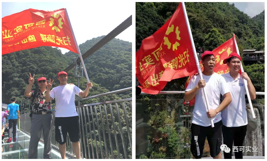 第二天,經過四十分鐘的登山旅途后,我們終于到達“云天波霸”,玻璃峽谷位于萬丈崖大瀑布的頂端,目之所及,懸崖峭壁、飛瀑擎天,透明度極高的玻璃棧道也是對勇氣的最大考驗,西可勇士們紛紛拿著旗幟在玻璃橋上拍照留念。